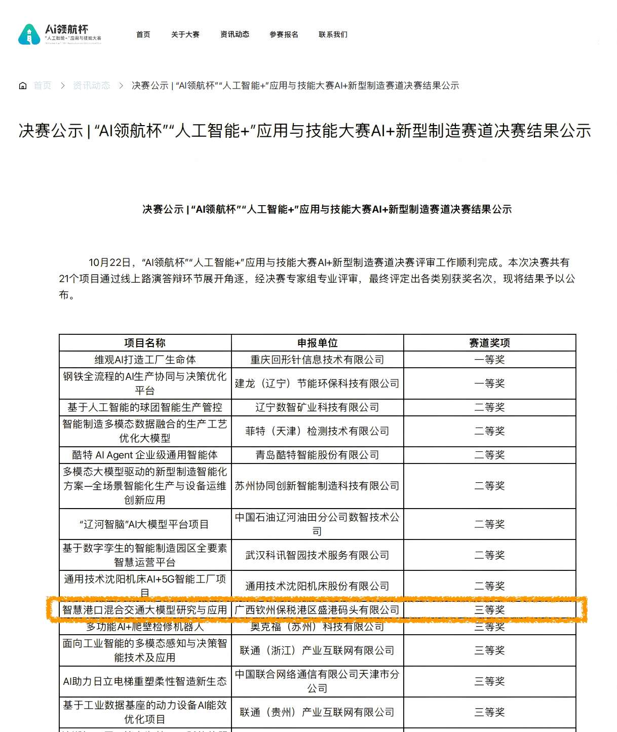 国内首例智慧港口混合交通大模型!北部湾港钦州自动化集装箱码头这个“人工智能+”项目荣获全国AI大赛三等奖