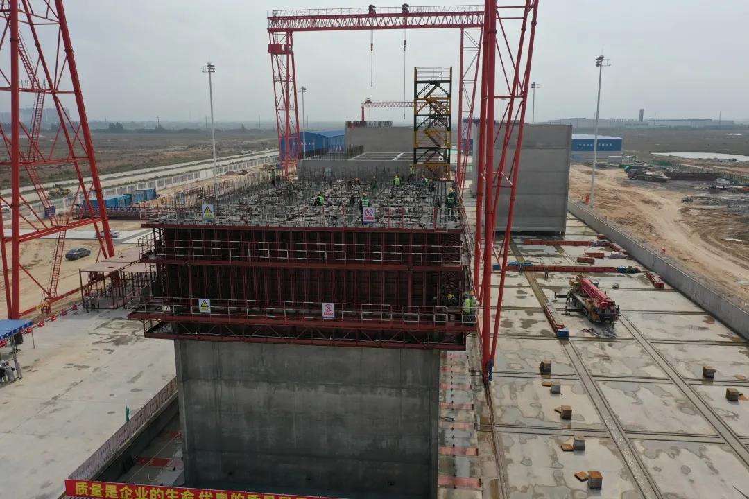 沉箱是码头水工的主体结构,为高质量完成工作任务,项目建成了北部湾最大最先进的数字化沉箱预制场,创新应用多项施工技术,致力于推进“机械化换人、自动化减人”,助推码头施工智能化、数字化转型升级。