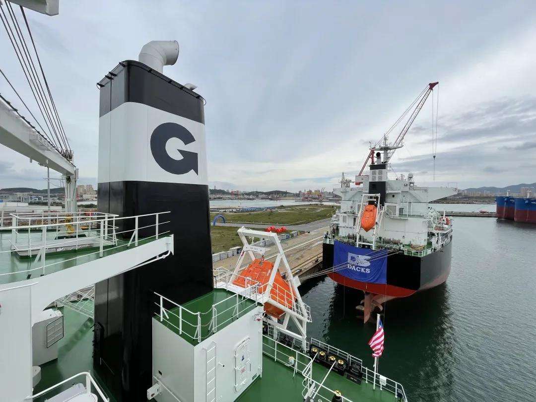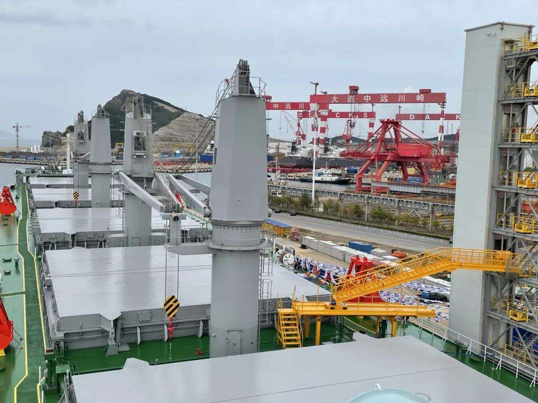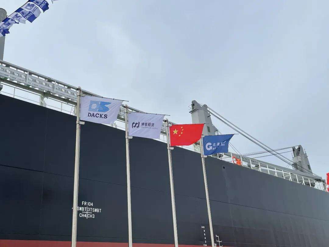 五星红旗、北港航运旗帜、浦银租赁旗帜,大连中远川崎旗帜迎风飘扬