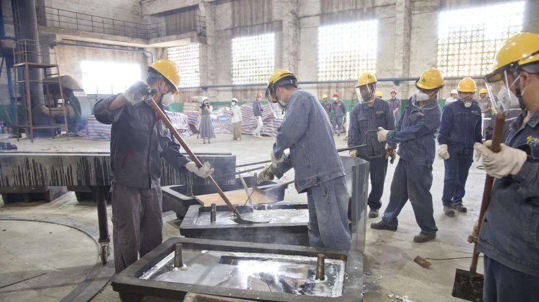 银白色的锌基合金溶液正注入铸型模具中