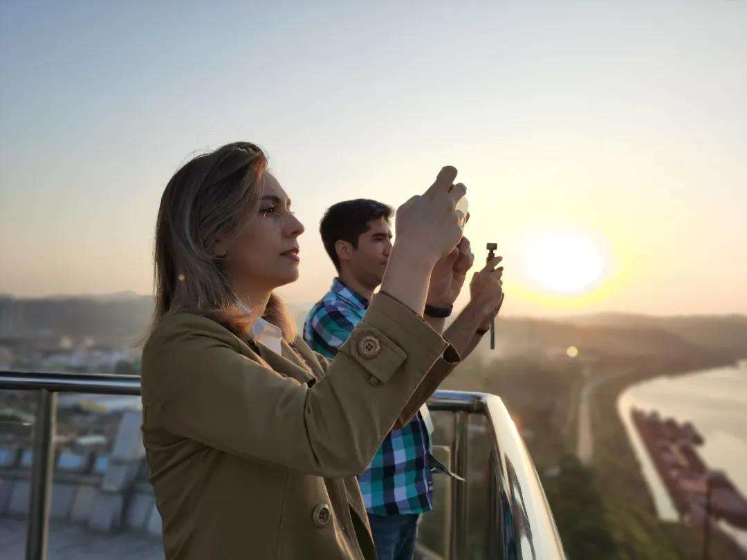 日落余晖撒在江面上,金黄的暮色衬托下,“西江小蛮腰”的剪影更为动人。采访团来到瞭望台,一边询问着关于长洲船闸建设、运行情况的细节,一边不停地举起手中的相机、手机,记录下眼前的美景。
