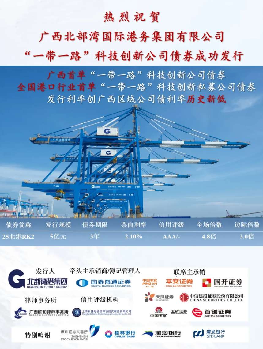 作为广西推进“一带一路”建设的主力军,北部湾港集团与金融机构深度合作,成功发行广西国企首单“一带一路”公司债券,发行规模10亿元,票面利率2.18%,创广西区域公司债票面利率的历史新低,进一步降低融资成本。该债券募集资金专项用于向“一带一路”沿线国家采购原材料,以实际行动深化与共建“一带一路”沿线国家的商贸合作,进一步提升广西产业链供应链韧性。此举不仅是全国港口行业首单由“知名成熟发行人”发行的“一带一路”私募短期公司债,也为地方国企借助资本市场服务国家倡议、实现融资提质增效树立了典范。