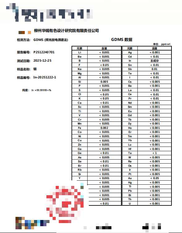 2025年12月25日,北部湾港集团旗下华锡有色设计研究院取得重大技术突破——成功研发并制备出纯度高达99.99999%(7N级)的高纯铟产品。经权威第三方检测,各项指标均达行业领先标准。这一成果标志着华锡有色设计院在高纯金属材料制备领域实现跨越式发展。