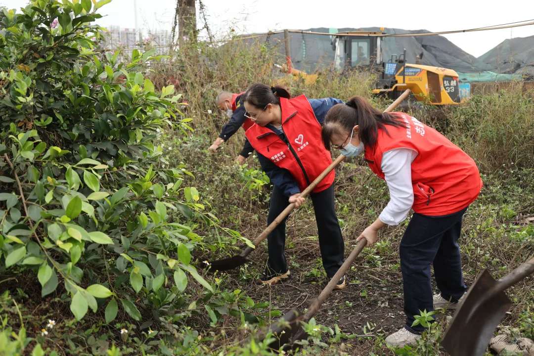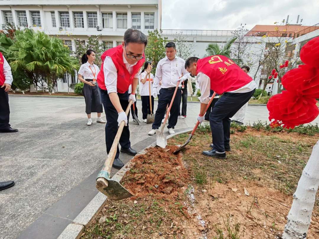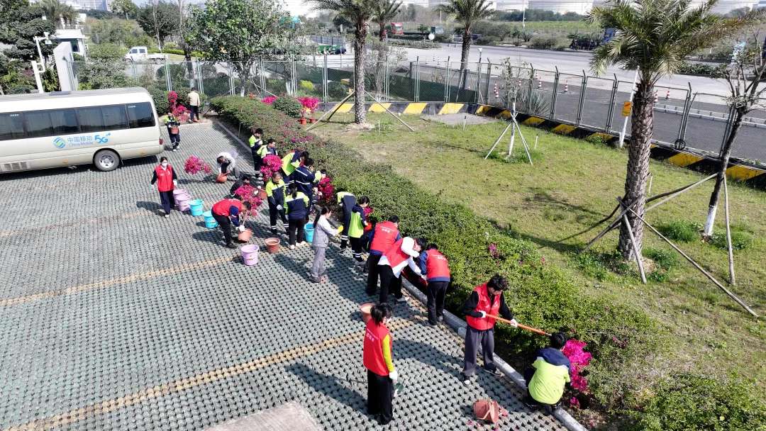 北港物流在西部陆海新通道钦州、北海联运中心,挥锹铲土,种下朱槿花、桃花和荔枝树苗。大家三五成群,分工协作,扶苗、培土、浇水,配合默契,共建绿色美好园区。