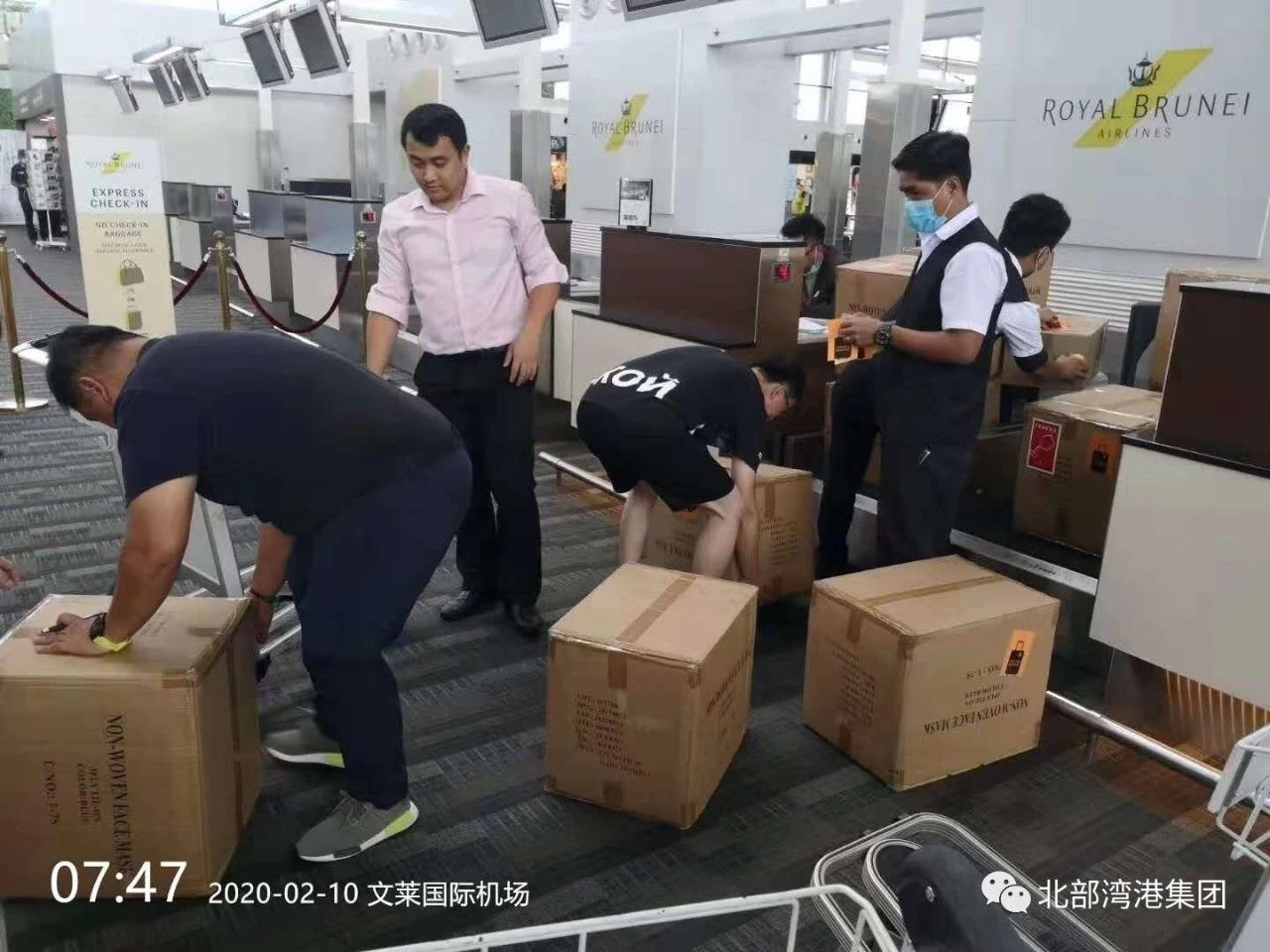 国内严峻的疫情形势也时刻牵动着北部湾港集团文莱摩拉港公司员工的心。摩拉港公司总经理曾彩礼和同事们主动联系了文莱的供应商,发动公司本地员工的有效资源多方联系,抢先采购到了数万支外科口罩及部分N95口罩,日夜兼程运送回国。而此次防疫物资采购工作更是得到了文莱政府及合作伙伴的大力支持,他们积极出谋划策并全力协助物资运送回国。