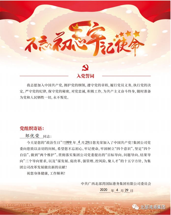 4月29日是北部湾港集团旗下、鱼峰集团党委柳州鹿寨金利水泥有限公司制造部党员邹优荣入党20周年的纪念日,正在值岗的他,收到了来自集团公司党委的问候和寄语。