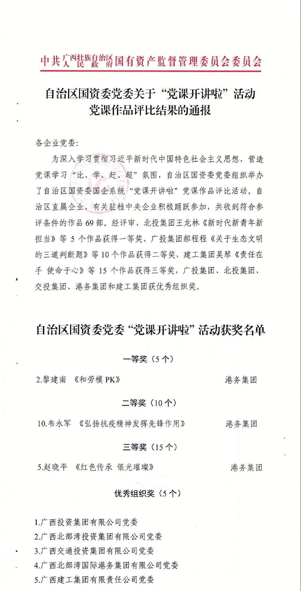 近日,自治区国资委党委通报全区国资国企系统“党课开讲啦”党课作品获奖名单。其中,北港集团选推的党课作品《和劳模PK》荣获一等奖!北港集团党委荣获“优秀组织”奖。
