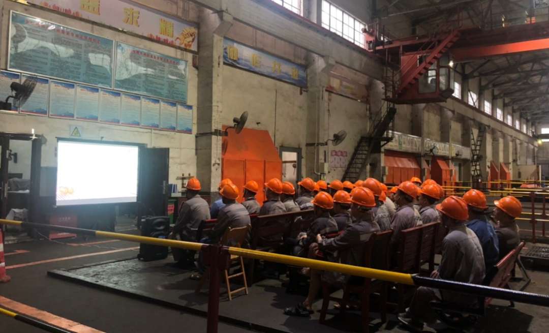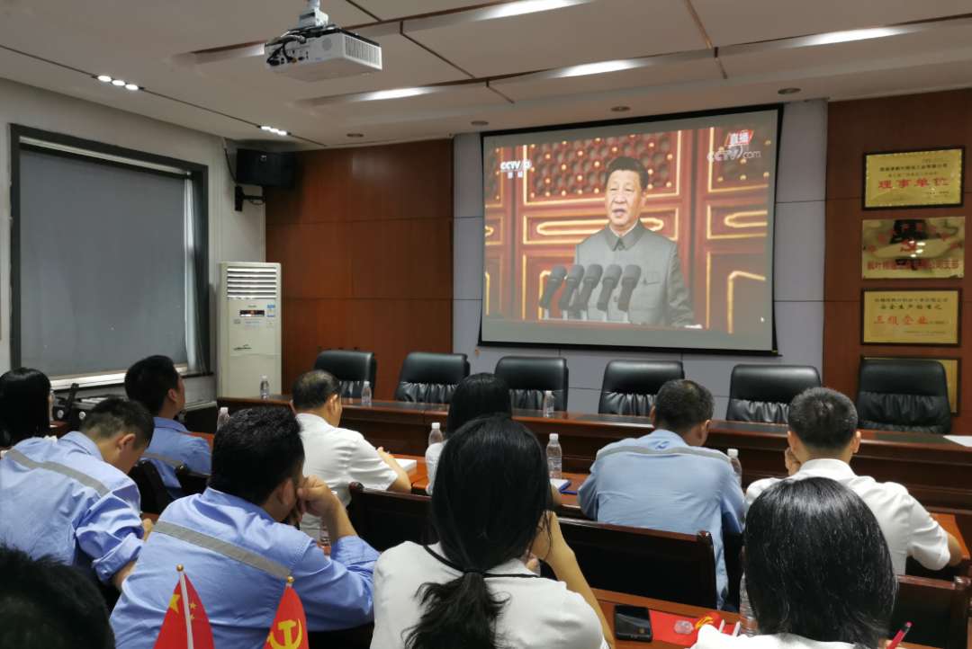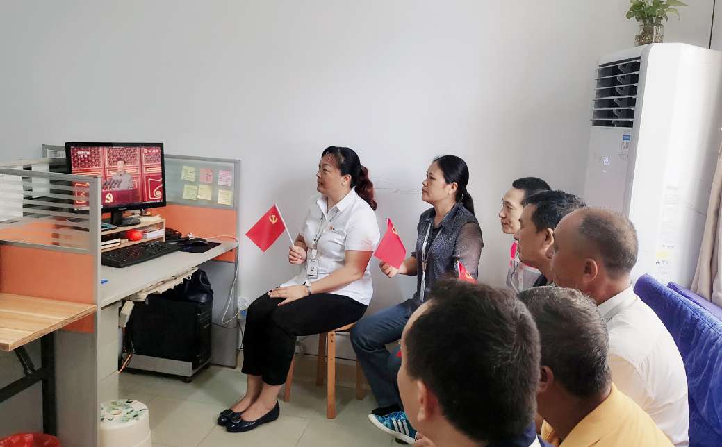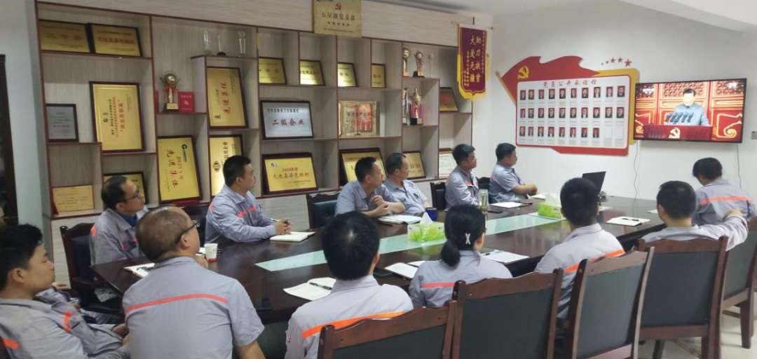 鱼峰集团金久水泥党支部在会议室收看现场直播。