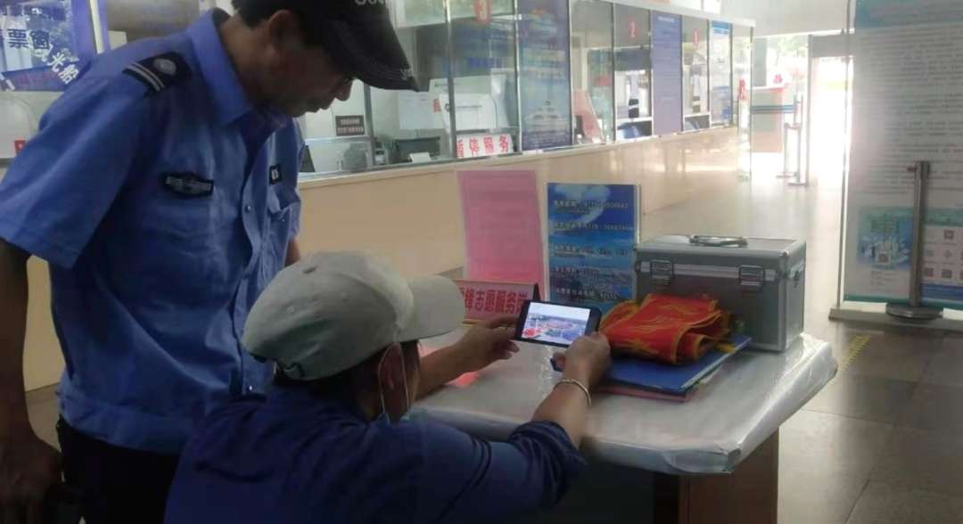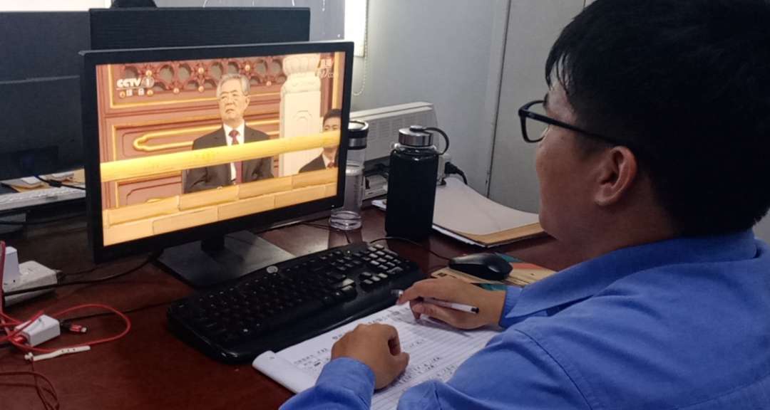 北海邮轮海角客运站一线工人在现场收听收看学习。