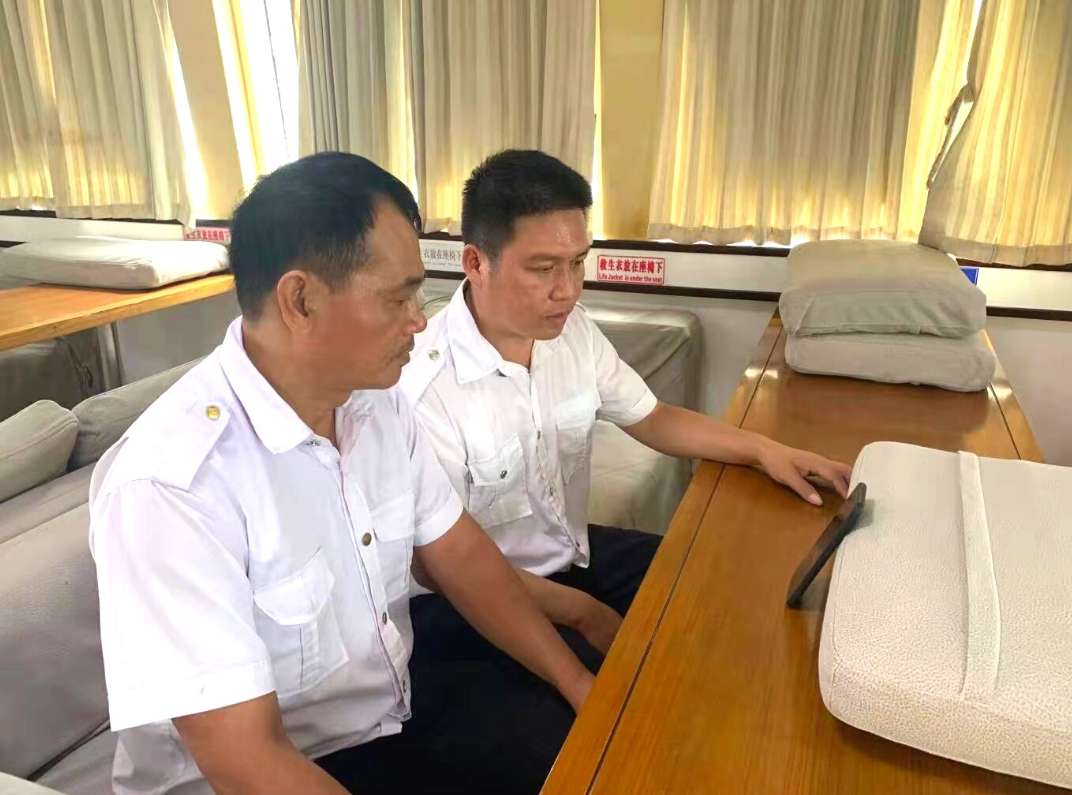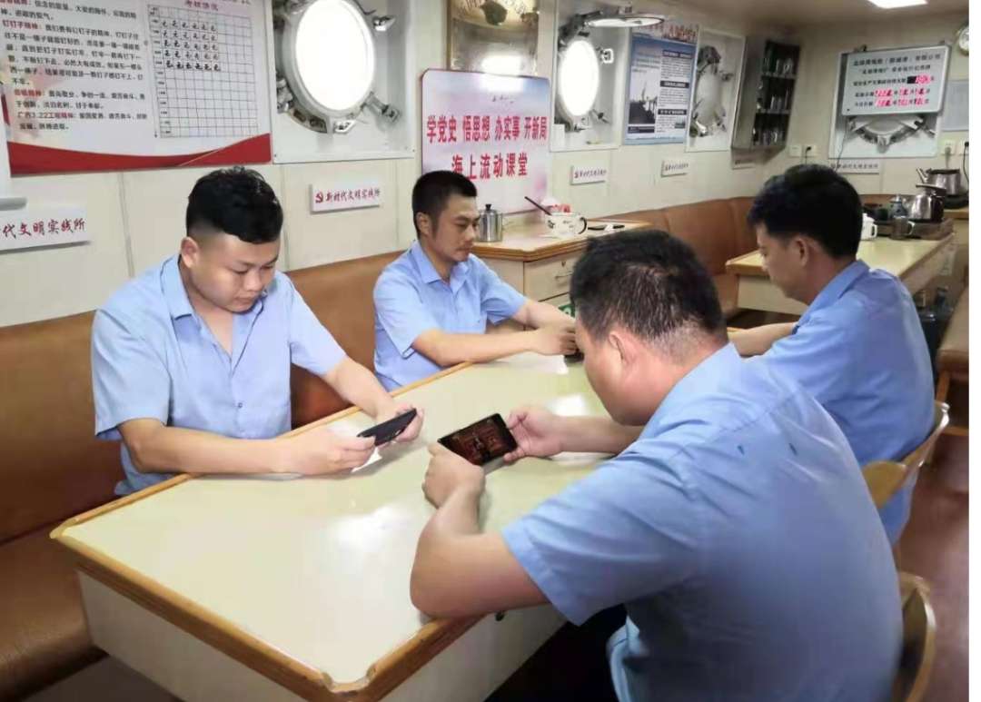 北港拖轮优秀青年骨干在“海上讲习所”观看庆祝大会盛况。