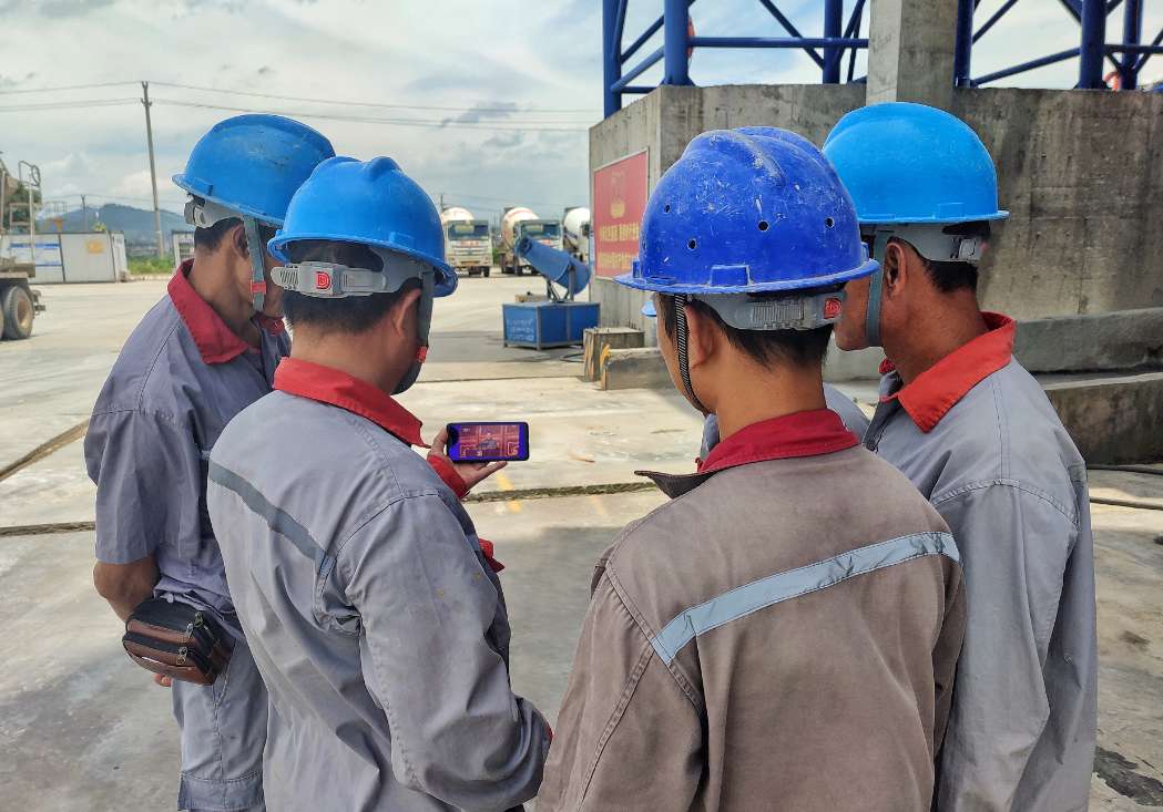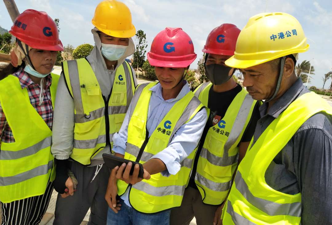 北港建设的一线员工在工地观看直播盛况。