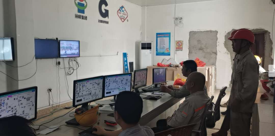 鱼峰集团云燕水泥烧成车间职工利用中控室电视观看直播。