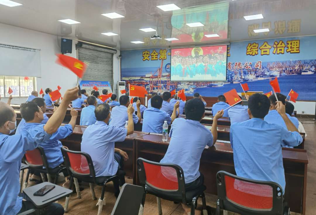 集团总部党员在北部湾航运中心观看庆祝大会。
